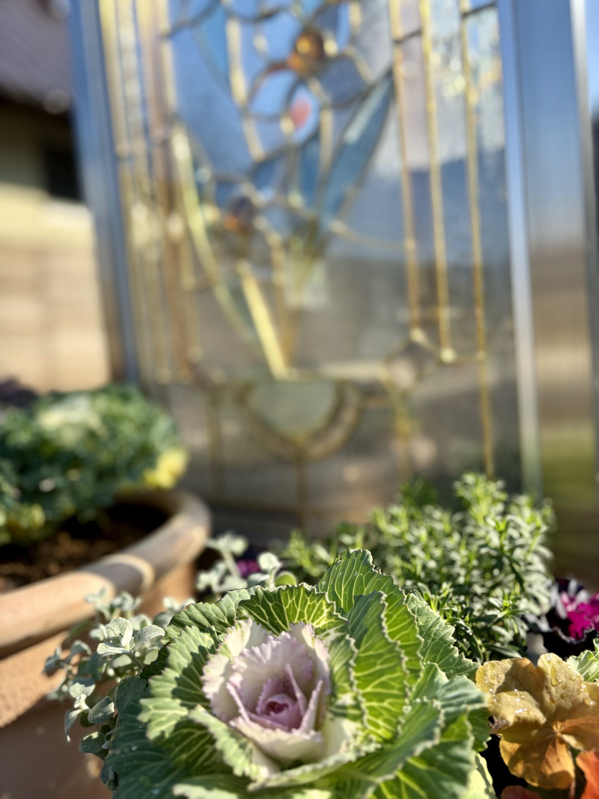 家族墓ステンドグラス脇に咲く葉牡丹の花💐花は誰が見ても、心の癒されます。お参りに来られた際は、ぜひご覧くださいませ。